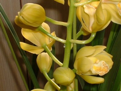 シンビジューム 何年もの間 毎年咲き続けている黄色のシンビジューム 大好きな色 茎の所に小さな水滴がある。ときどきそっと指を伸ばして、この透明な液体をなめてみる。癖が無くてとっても甘い、蜜。 花びらの中にも水滴が出来るがこちらはちっとも甘くない。 なんでだろー? 2月28日 記 |