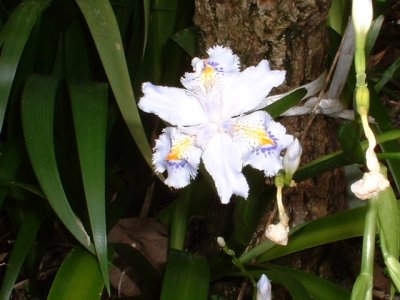 シャガ 裏庭のキュウイの木の根元に咲いているあでやかなシャガ 私の感じるイメージは春よりも初夏に似合いそう! 4月21日 記 |