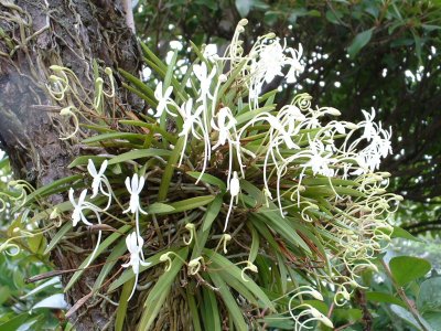 | 風蘭(ふうらん) 今年も風蘭の咲く季節になりました。まだ2分咲きぐらいですが朝玄関先まで甘い香りが漂ってきます。真っ白な花はとても気持ちをなごませてくれます。毎年変わる事無く何時までも愛でる人の為に咲き続ける。 6月30日 記 |