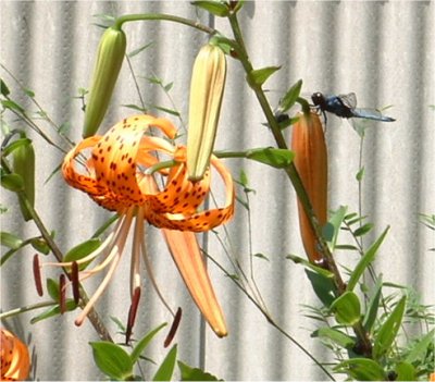 鬼百合 毎年同じように同じ場所に自生するオニユリ 色も形も好きという訳ではないが、毎朝食事をしながら眺めている。数日前からシオカラトンボが何時ものように止まり木に使っている。庭に出て指を差し出すと、早速指先に止まった。 今年も変わらず私の事好いてくれてるようだ。 7月15日 記 |