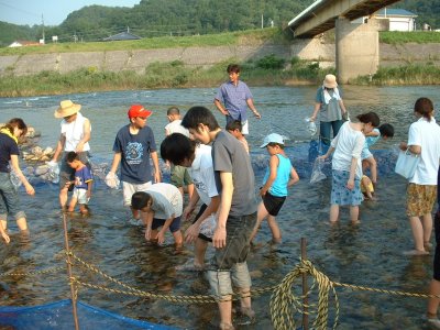 鮎のつかみ取り 大人も童心に帰って鮎を追う。 どっかで見た顔だなー! 8月 2日 記 |