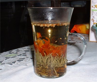 工芸茶 今まで工芸茶なるものがある事を知りませんでした。台湾も中国も行ったけどこんなの見た事ないよ。小山君が中国茶の輸入販売はじめたから送ってやると言って、一昨日届きました。一緒に送られてきたハリオのコップに苔球みたいなものを入れお湯を注ぎます。しばらくすると苔球みたいなものが開き中から鮮やかな色の花が開きます。これは丹桂飄花というお茶です。柔らかな味と香りがします。8種類の工芸茶が入っていました。ぼちぼちと味わってみます。今は東方美人という烏龍茶を試飲中です。こんなお茶に興味があったら東方茶館を覗いてみてください。 7月 15日 記 |