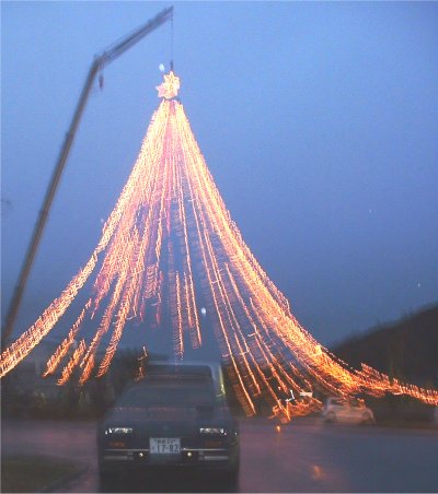 イルミネーション 23日から25日まで 国道脇の障害者福祉センターで大型クレーンを使って 高さ30メートルの巨大ツリーを作りました。 当日は大きな事故や事件も無かったので NHKの地方版のニュースで取り上げられていました。労力が形として残らないものだけど それはそれで良いかな?後片付けも大変でした。「来年もしてもらえますか?」という声に 「うん。」という返事は誰からも返ってきませんでした。 危険という事でクレーンのブームを上げたままで置いておく事が出来なくて毎日の上げ下げにくたびれてしまうから。 12月25日 記 |