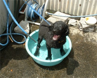水あそび 毎日の暑さにぜーぜーとへばりぎみのふらっとに大きな洗面器(小さなたらい)をプレゼント。ふらっとは水が大好きです。 顔を水の中に浸けるのも平気です。潜水する犬に特訓しようかな。先日、家の前の川で鯉にパンをやっていたら、水に浮かんでいるパンを拾い食いしようとして前足からズボッと落っこちたんです。後ろ足は陸の上です。顔を水の中に突っ込んだまま動かないから溺れたかと思って引っ張り上げたけど、当の本人は何も無かったように平気な顔をしていました。 7月 9日 記 |