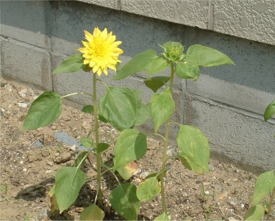 ひまわり あとりえの横壁の所に 画家 モネ の描いているひまわりの花が咲きました。 予定では草丈120センチなのですが、どういうわけか40センチにしか伸びませんでした?車からだと気がつかないかなー。 土がとっても痩せていたんでしょうね。育ち盛りのときに手をかけてやらなかったから今更肥料を与えても遅いだろうね。子供への愛情のかけかたと同じかなーなんて思ったりして。 小さな花だけど鮮やかな黄色です。 7月7日 記 |