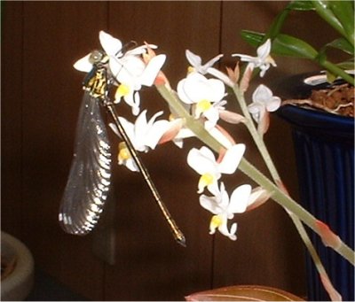 とんぼ この暖かさのせいか、今年初めてのとんぼです。身体が深緑色です。名前のわからない小さな蘭科の花も数年ぶりに咲きました。 とんぼの大きさは4センチくらいで,羽は透明です。 今年も手乗りとんぼ来るかなー? 4月 20日 記 |