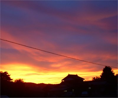 夕焼け 綺麗な夕焼けを見たら何となくその日一日得をしたような気持ちになるね。自宅の前から右手の方向を見ると、西になって山の稜線が見渡せて時々思う。「綺麗な風景を見て心洗われる」なんてよく言われるけど、別に悪い事してるわけじゃーないけど、そんな感じかな。 7月 27日 記 |