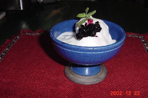 アイスクリームの上に自家製のカスピ海ヨーグルトとブルーべリージャムを