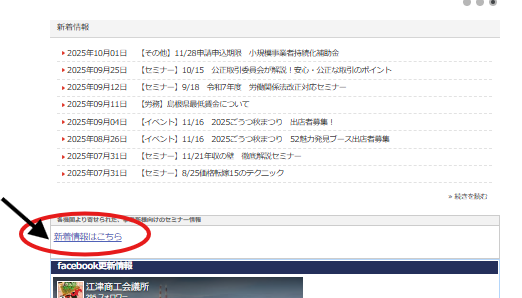 【その他】セミナー情報について 当所ホームページに事業所様向けのセミナー情報掲載ページができました。 行政、関係団体から寄せられた事業所様向けのセミナーを今後集約してまいりますので、是非ご活用ください。 新着情報は、商工会議所ホームページ、トップ画面の新着情報下のリンクからとぶことができます。