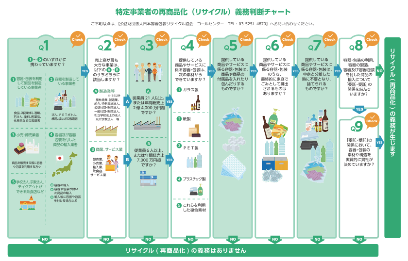 容器包装リサイクル法では、容器や包装を利用して商品を販売する事業者や、容器を製造したり輸入する事業者は、「特定事業者」として再商品化義務を負うこととなっています。
