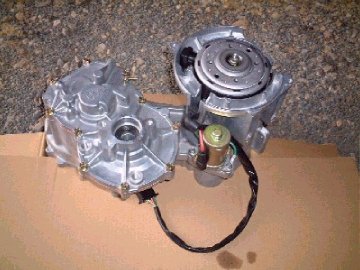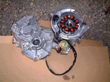 ![]() ↑ステーター(右)とスターターモーター(右下)をつけた状態 |