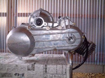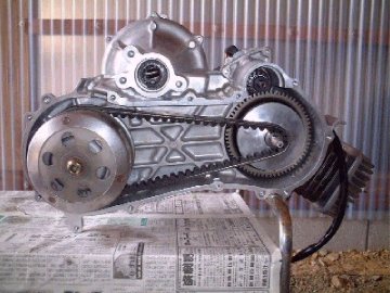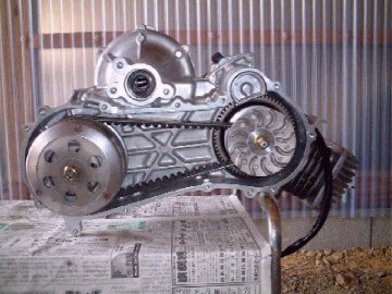 | シリンダーの付け方を間違ったまま作業はVベルトCVT編に突入。 ここでは変速機関係の組み立てを行った。 すなわち、スタータードリブンギヤ、ムーバブルドライブフェイス、 クラッチ/ドリブンプーリー、ドライブフェイス、スターターピニオンホルダー、 Lサイドカバーの取り付けである。 スタータードリブンギヤ、ムーバブルドライブフェイスの取り付けは難なく終了し、 続くクラッチ/ドリブンプーリーの取り付けも簡単に終わるかと思われたが、 ここに困難な作業が待っていた。 ドライブベルトがきつくてドライブフェイスボスに引っかからないのである。 太いベルトだが、あまり引っ張ると切れるかも知れず、 かといって引っ張らないと引っかからない。 そこで、しばらくは引っ張っていたがやはり引っかからず、 ドライブベルトをゆっくり動かしながら引っ張ることでこれは解決した。 あとは、スターターピニオンホルダーの液体ガスケットを塗布するところを間違えたり、 LサイドカバーパッキンがずれたままLサイドカバーを取り付けようとしたりしたが、 それほどの困難もなくVベルトCVT編の作業は終了した。 |