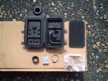 ![]() ↑エアクリーナー(上左)、フィルター(上右)、コネクティングチューブ(下左)、 エアクリーナーステー(下中)、ホースバンド(下右) |