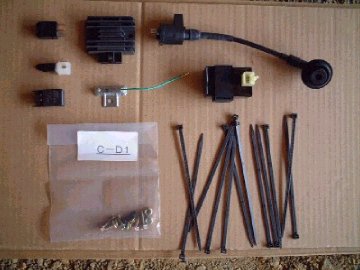 ![]() ↑左上から下へスターターリレー、ヘッドランプリレーコントローラー、ヘッドランプリレー、 レギュートレクチファイア、レジスター、イグニッションコイル、C.D.Iユニット |