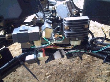 ![]() ↑左上から右へC.D.Iユニット、イグニッションコイル、レジスター、 レギュートレクチファイア、ヘッドランプリレー、ヘッドランプリレーコントローラー、 スターターリレーを取り付けたところ。わかる? |