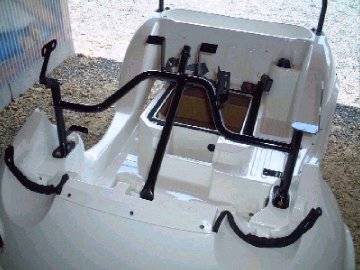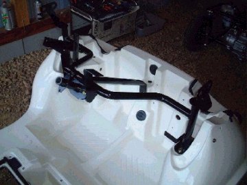 | 続いての作業はインストステーの取り付けである。 まず、インストステーASSYにステアリングシャフトステーを取り付け、 これをフロアに取り付ける。 フロアの取り付け個所には中央にボディーマウントロアーラバー、 ボディーマウントアッパーラバーをはめ、サイド部分にはインストステーマウントラバーを置く。 そして、中央、サイドとボルトで留めていく。 この作業も先ほどのルーフガイドの取り付けと同様に2人でする作業になっている。 しかし、インストステーはルーフガイドよりも安定していて倒れそうになく、 ルーフガイドの取り付けの実績があるので特に難しいことはなかった。 ただ、中央の部分を留めるのに(フロアの下側)手が届かなかったのには困った。 それとサイド部分の取り付け方がうまくなかったので、 つけ直して少し時間をかけてしまった。 手が届かなかったのは、手を入れるところを変えたらどうにか届いたので 指定の強度で留めることができた。 |
