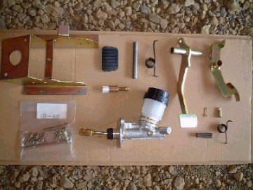 ![]() ↑ペダルベースを構成する部品の数々。 左上からペダルベース、ブレーキペダルカバー、カラー(L101.5)、 ブレーキペダルリターンスプリング、ブレーキペダル、アクセルペダル。 中央のがストップスイッチ、中央下はマスターシリンダーASSY。 右下の方にあるのはスナップピン、クレビスピン、 カラー(L44)、アクセルペダルリターンスプリング。 |