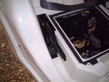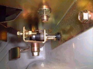 ![]() ↑アクセルペダル切り欠き部に引っ掛けられたアクセルワイヤーケーブル。 左の方に見えるのがアクセルペダル |