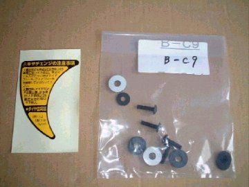 ![]() ↑ギヤチェンジの注意事項とタイヤ空気圧が 表示されたコーションラベル 袋の中の大きい輪っかはインストマウントラバー |