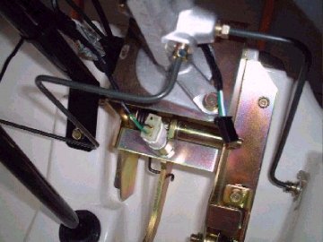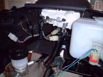 ![]() ↑中央の黒い線がスピードメータケーブル。 カプラーは左からワイパースイッチ、スタータースイッチ、イグニッションスイッチ(上)、 コンビネーションメーター(下)、ウォッシャータンクに接続してある |