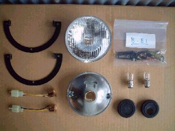 ![]() ↑ヘッドランプステー(左上)、ヘッドランプソケット(左下)、 ヘッドランプユニット(中央)、ヘッドランプバルブ(12V18/18W)(右中)。 グロメット(φ42)(右下)のひとつには穴が・・・ |
