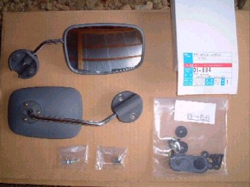 ![]() ↑サイドミラーRとサイドミラーL。 サイドミラーが入っていた箱(右上)には 「ダイハツ、ハイゼット」と印刷されたシールが。 小さな袋はサイドミラーの付属品のビス類 |
