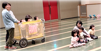| 「ぺったんこ!それ、ぺったんこ」と歌いながら、子ども達はお餅つきを楽しみにしています。 昔ながらの伝統行事に親しみ、お餅の感触や出来上がるまでの工程を楽しみたいと思います。 |