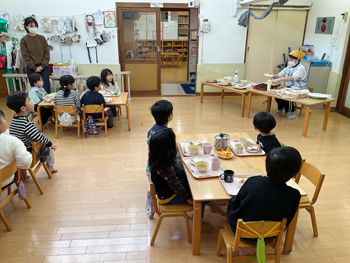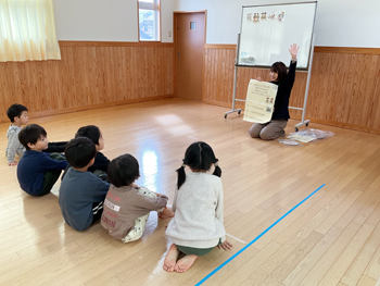 高津学校給食センターの栄養士さんに来ていただき、ぞう組さんが学校給食の話を聞きました。 |