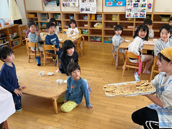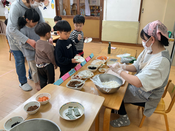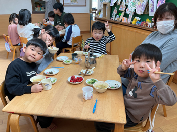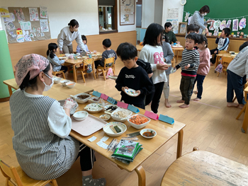 | 子ども達が食べる事に興味を持ったり、楽しい!と感じられるよう、安心・安全な環境で給食・食育活動をしていきます。 給食メニューで気になるものがあれば、お声がけ下さい。 レシピをお渡しします。 |