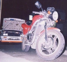 地元に帰って峠のギャラリーコーナーの谷に落ちました・・・途中ひっかかって止まりましたが・・・ 斜面を転がり落ちる車中で・・・死を覚悟しました・・・が、生きてます(笑) |