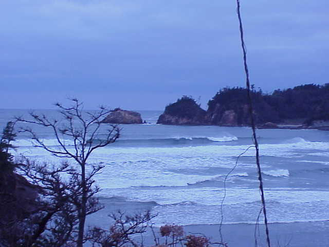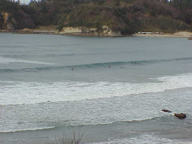 年末に雪が積もってその後温かな日がしばらく続いたが、この数日まえから気温がガクンと下がって雪も 少し積もった。この日の朝波チェックに行く途中の国道の気温は1度。北からのうねりが入っていたが一旦 帰った。昼前から風が南東になって、陽がさしてきた。昼過ぎに福光に行ってみると朝のうねりがすこしお ちていてオフショアのなかでチューブを巻く波が目にとびこんできた。急いで入って1時間くらいでタルメ になってしまった。2枚目の画像は上がった時のもの。
