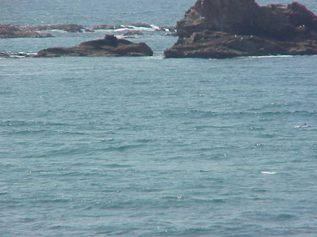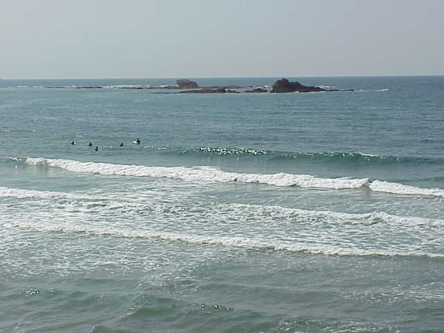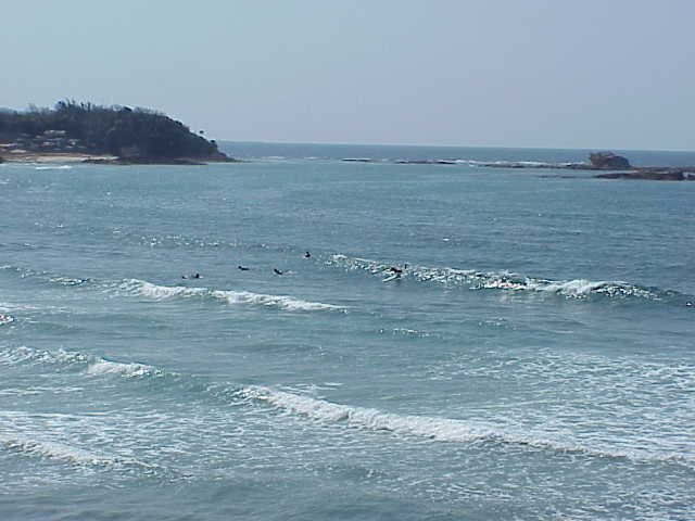 | この日は朝北のうねりが残っていた。腰くらいのわりとカチッとしたいい波だったと思う。 昼過ぎには今度は西風が吹いてきて北西の波となった。これもまあまあの波。さすがにそろそろ春の風。 ところで、昼過ぎにこの画像を撮っている時、この手前のサーファーとほぼ同じ大きさと同じ数の魚の群れが沖の島の 手前で跳ねている。見間違いかと思ってしばらく見ていたがやはりさかんに水面から跳ねたりもぐったりしている。画像 におさめようとしたが上手く撮れなかった。3枚目の右端にわずかに背ビレが映っている。後から人に聞いたらイルカの 群れだとのこと。この辺の海にもよくいるらしい。小魚の群れを追って来るらしいが、春になったんでイルカも波に遊ぶ。 |
