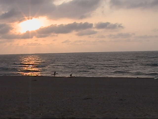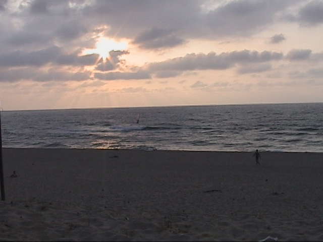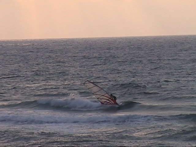 この日は波子に1年ぶりにウインドに出かけた。この次の日から海水浴場のオープンで、当分近づけなくな る。北東の軽い風が一日吹いて、スラロームなら面白そうな日だった。夕方までねばってやっと6時半くらい から5.5と260でなんとかプレーニング1時間程度。