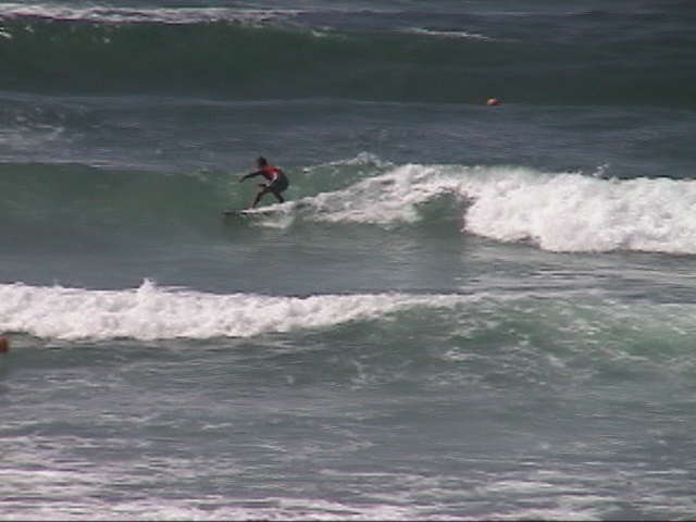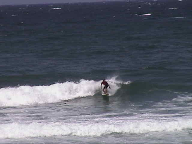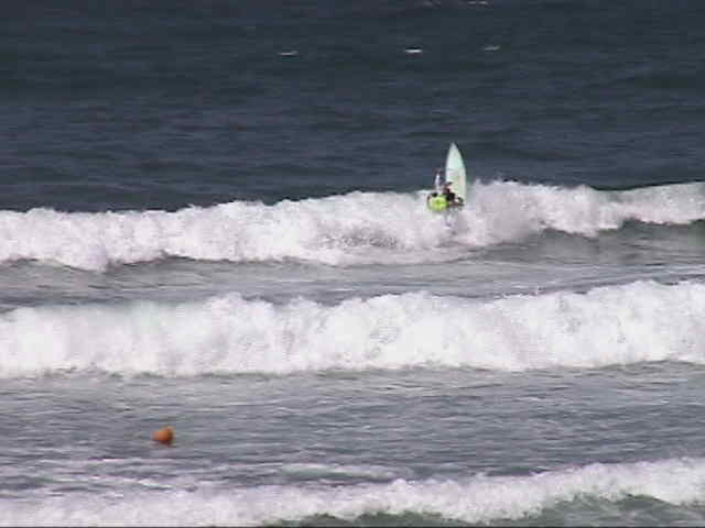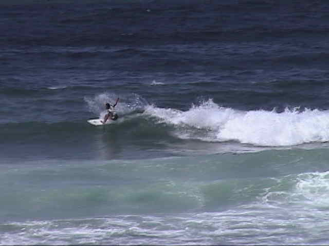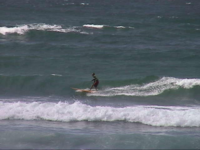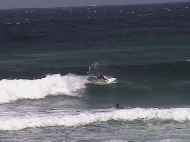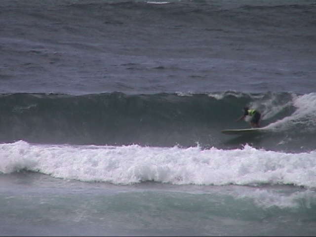 この日は大会。前日3時頃からクローズした南西のうねりがややおちついて、千畳の左側は風の陰になって いた。それでも南西風は吹きつづける。 午前中は仕事だったため、昼に千畳へ。バリバリのエキスパート達が競いあう。大会にはいつも「波乗り 道」の雰囲気がみなぎっている。fからも4名参加。みんな健闘した。