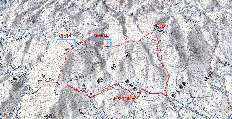 この日は、かりお茶屋へ車を停めて、反時計回りに臥龍山から掛頭山へ縦走して元の場所へ戻りました。