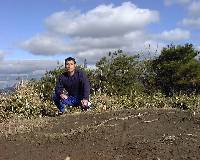 | 山頂で記念撮影 ズボンは露でビショ濡れ |